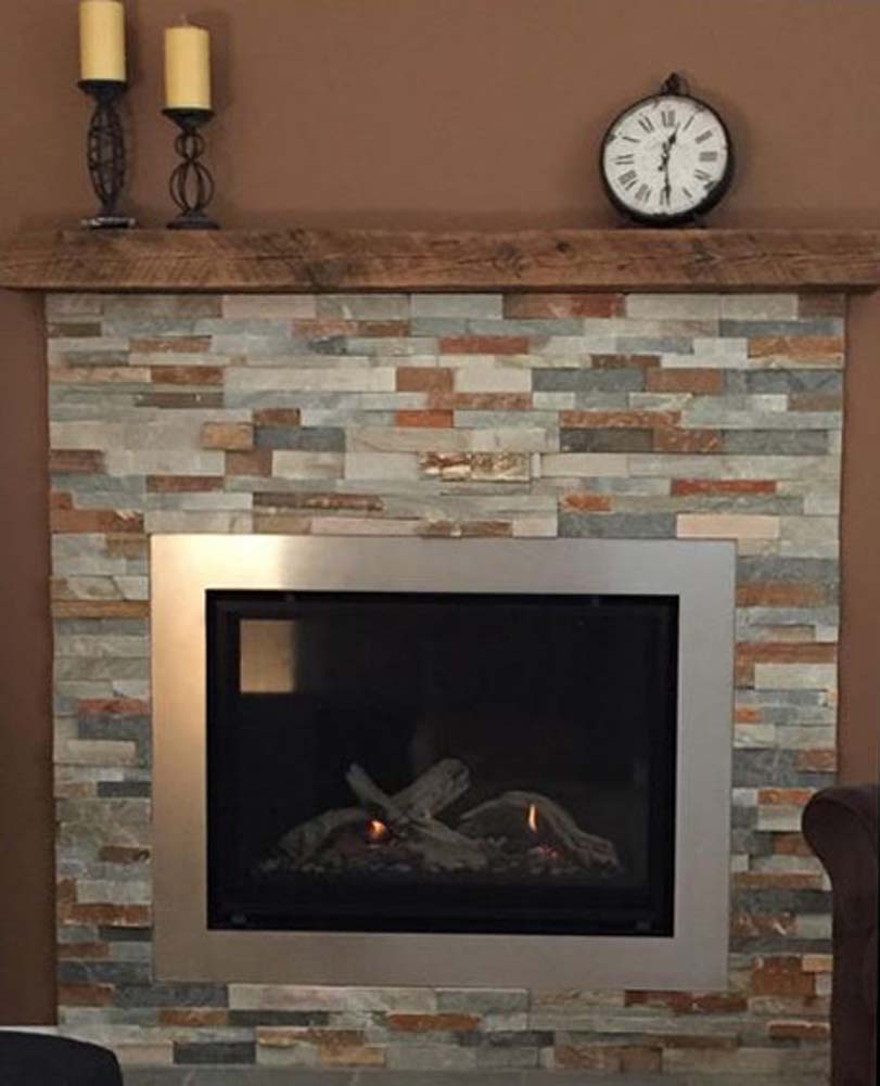 Mantel beams are solid wood with light old circular saw marks, medium rustic brown color, and a clear lacquer finish.